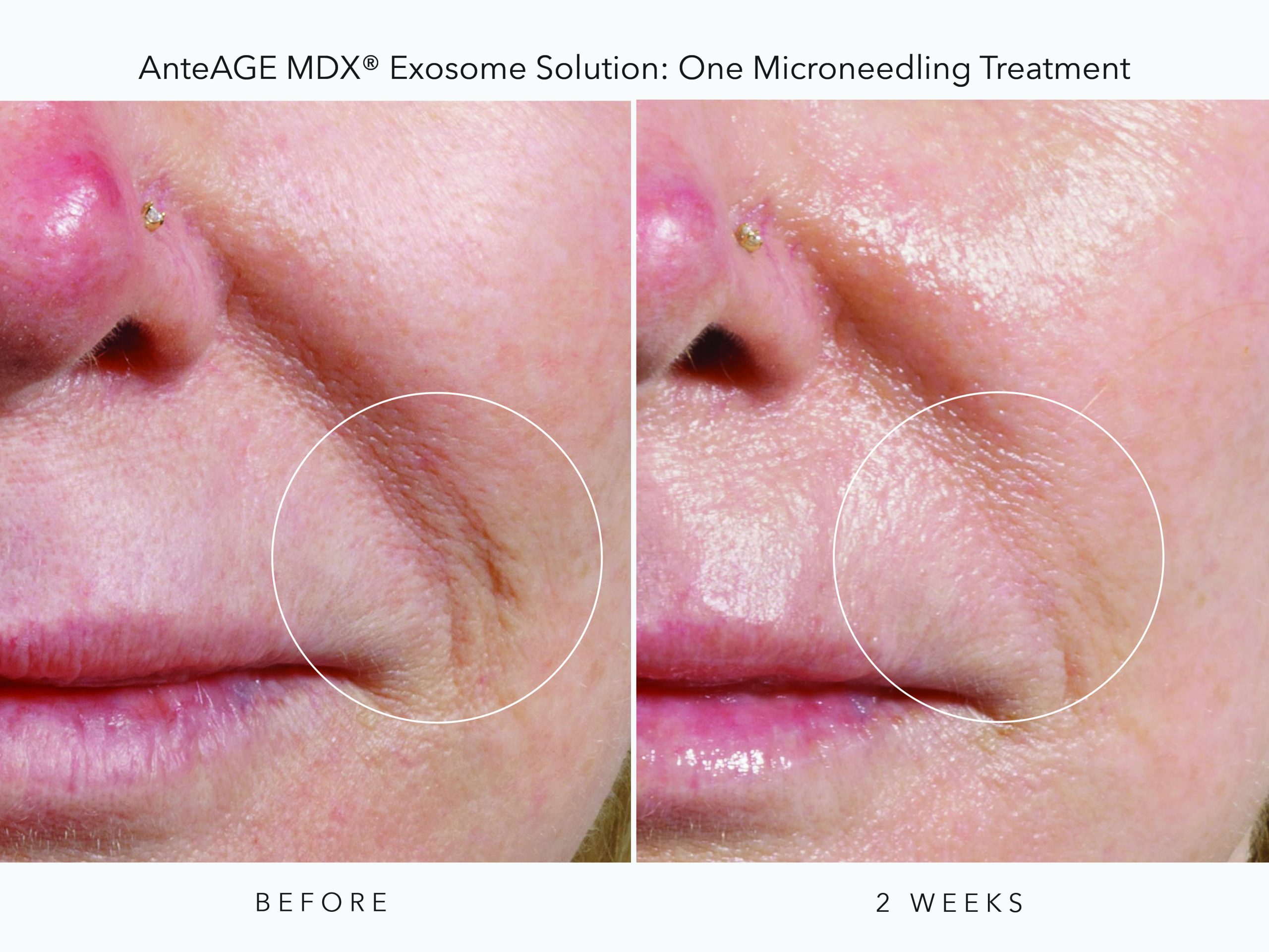 Advanced microneedling uses AnteAGE exosomes during microneedling and post-treatments. AnteAGE MD® Microneedling Solution contains pro-healing, anti-inflammatory growth factors and signaling peptides derived from laboratory cultured human bone marrow mesenchymal stem cells. These specialized cells help regenerate healthy skin cells and enhance microneedling results. In fact, advanced microneedling with exosomes results are equal to 3 regular microneedling treatments. With the addition of exosomes, microneedling downtime is significantly reduced and results are greatly enhanced.