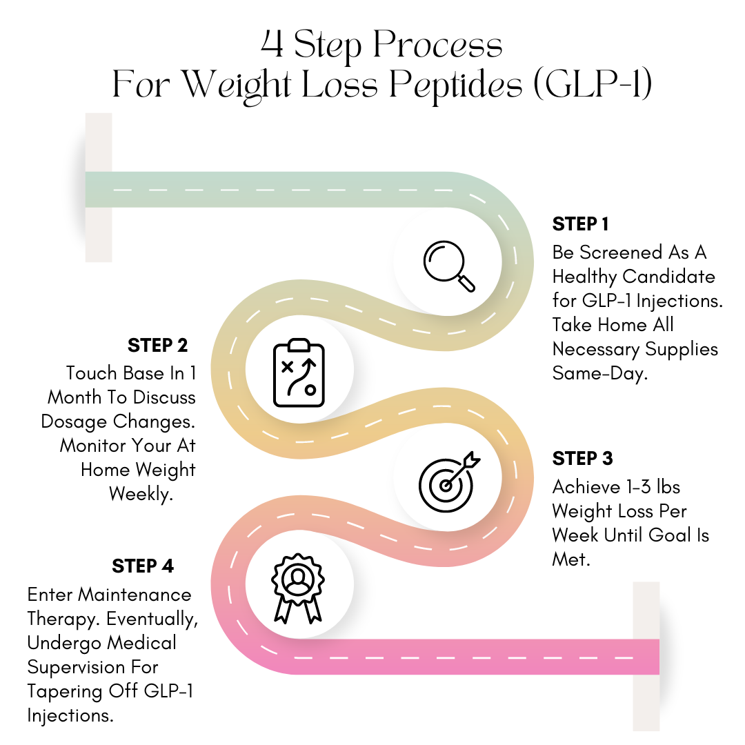 What if we told you there’s a breakthrough solution that’s changing the weight loss game? GLP-1 medications, or weight loss peptides, have been around for 20 years, and currently, 1 in 8 Americans have experience with a GLP-1 medication. GLP-1 stands for glucagon-like-peptide 1 agonists, which regulate appetite by increasing naturally occurring hormones called incretins, making people feel full longer. Our weight loss program is completely customized for you with all-inclusive care; follow-ups, symptom support and monthly check-ins.